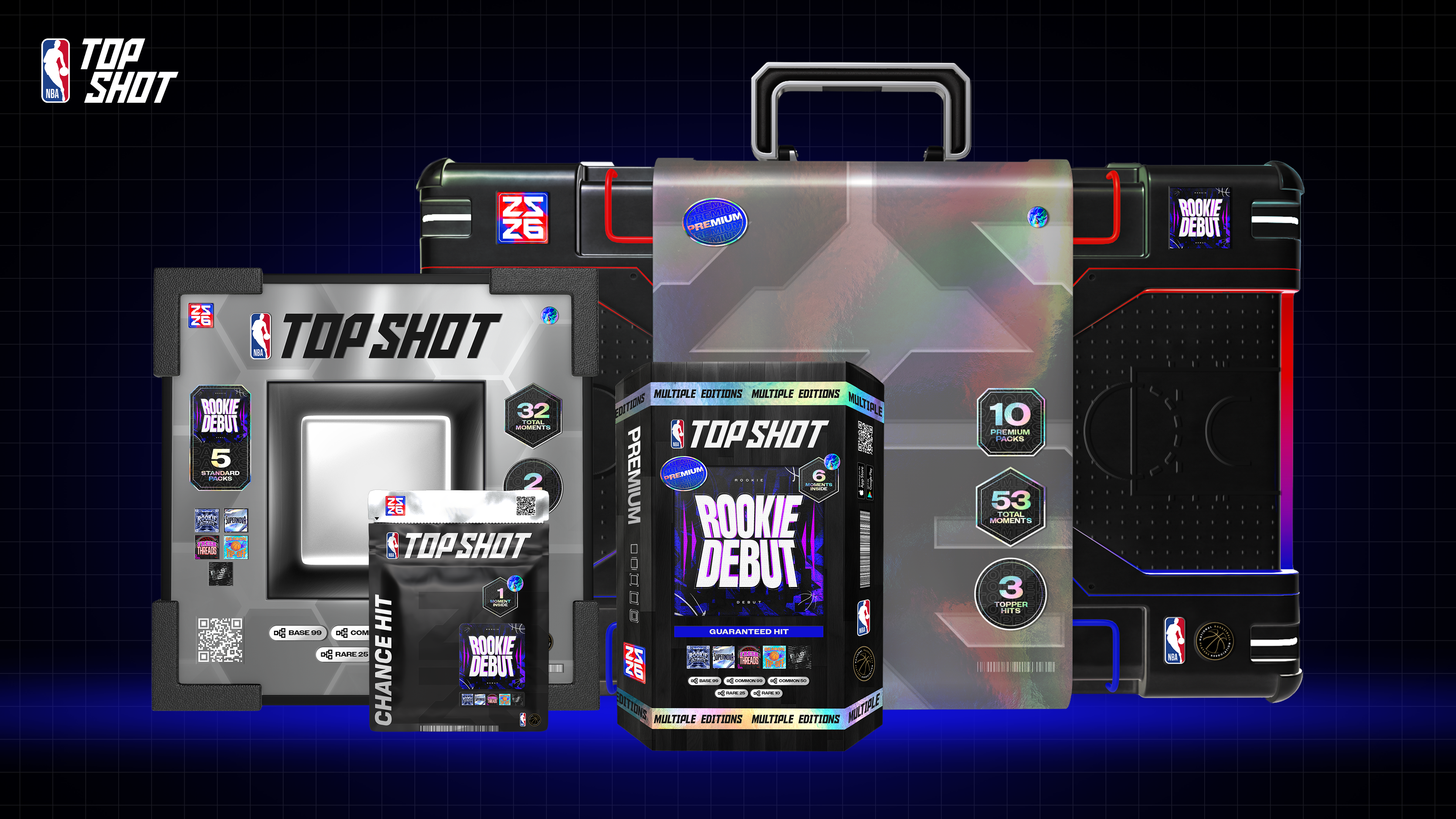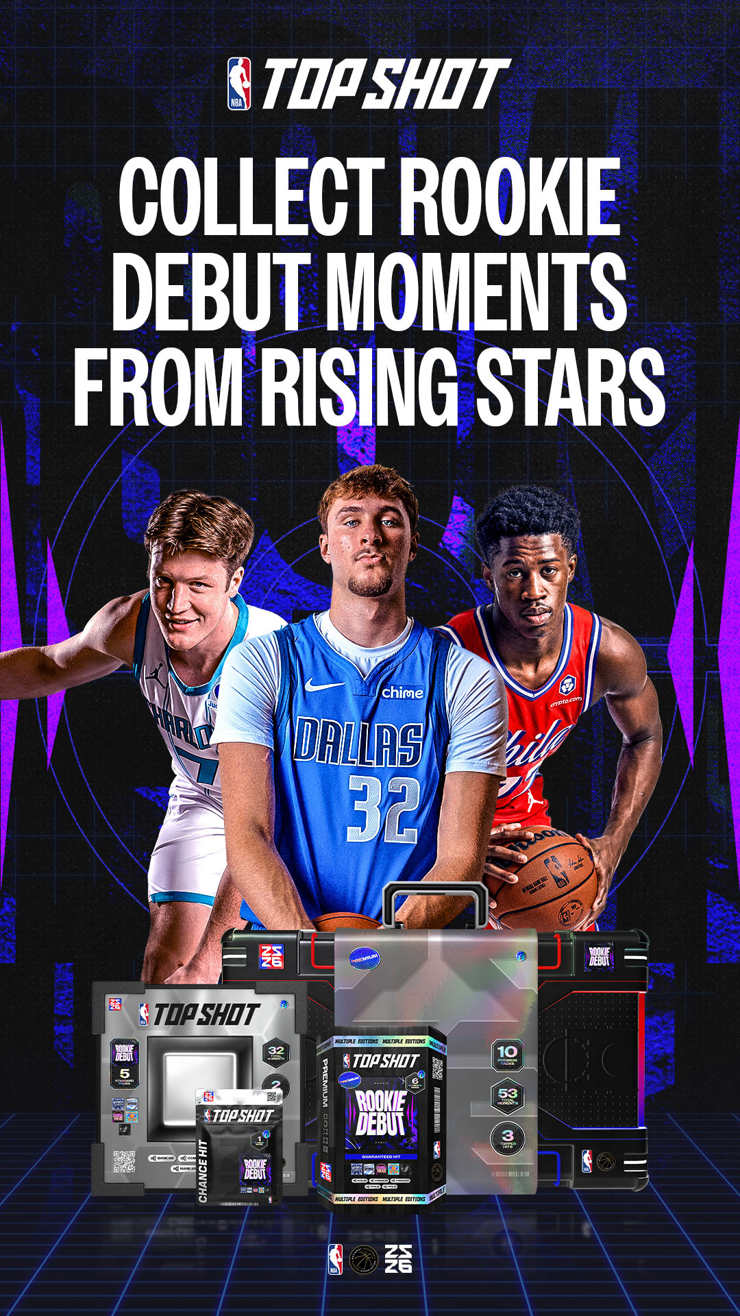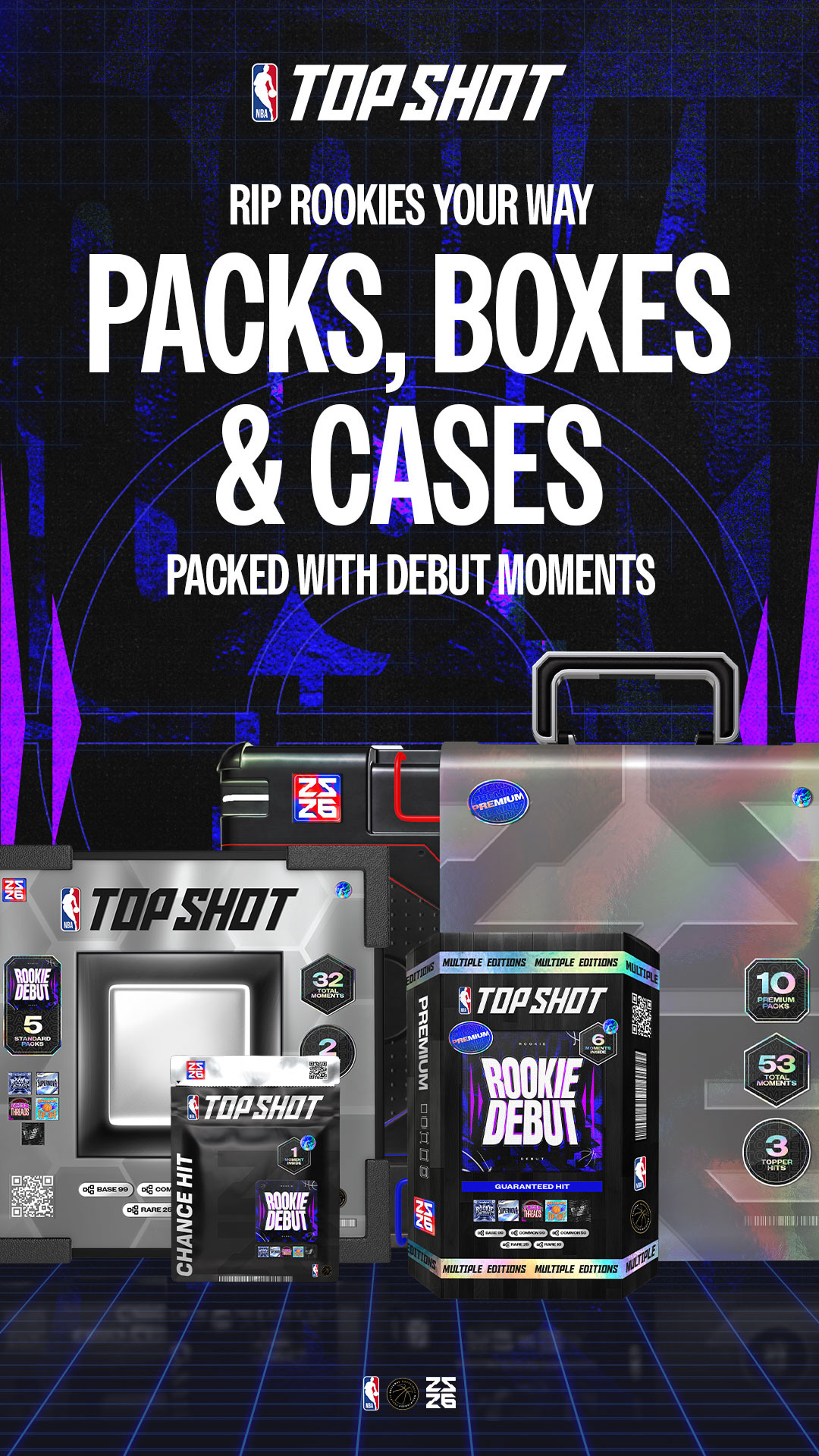 The season-opening campaign and first set release, Rookie Debut 25–26 sets the visual direction for the year. This drop introduces a refreshed pack system across utility packs, hard packs, boxes, and cases. Leading art direction and execution, I evolved the original 2022 design into a scalable system applied across product and marketing, delivering a cohesive experience for the next generation of NBA talent.